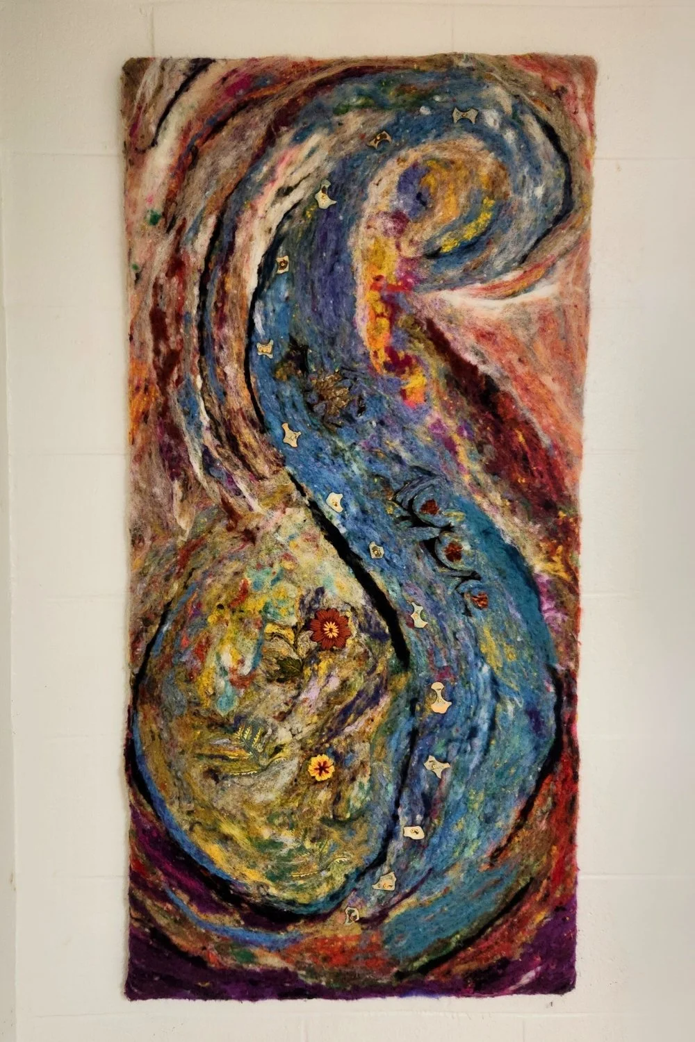 Needle felting is a fiber art technique that uses barbed needles to interlock and compress wool fibers. When creating a needle felted tapestry, the artist layers dyed wool onto a base surface to paint with the fibers. The result is a richly textured textile artwork that blends the softness of felt with the depth of traditional tapestry.